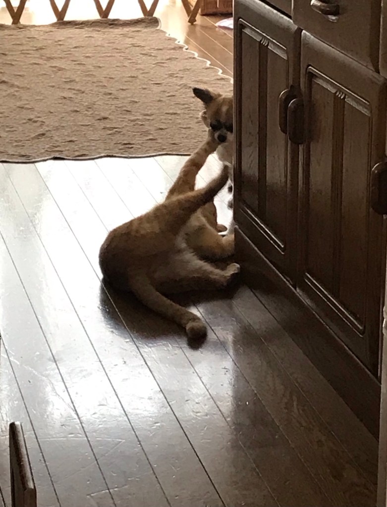 本日のおまけ②『ポンちゃん、そんなに急がないで、、チコはカーペットに隠れて待ち伏せしてるのに、、間に合わないやん』ほら、チコの手が見えてるでしょ?