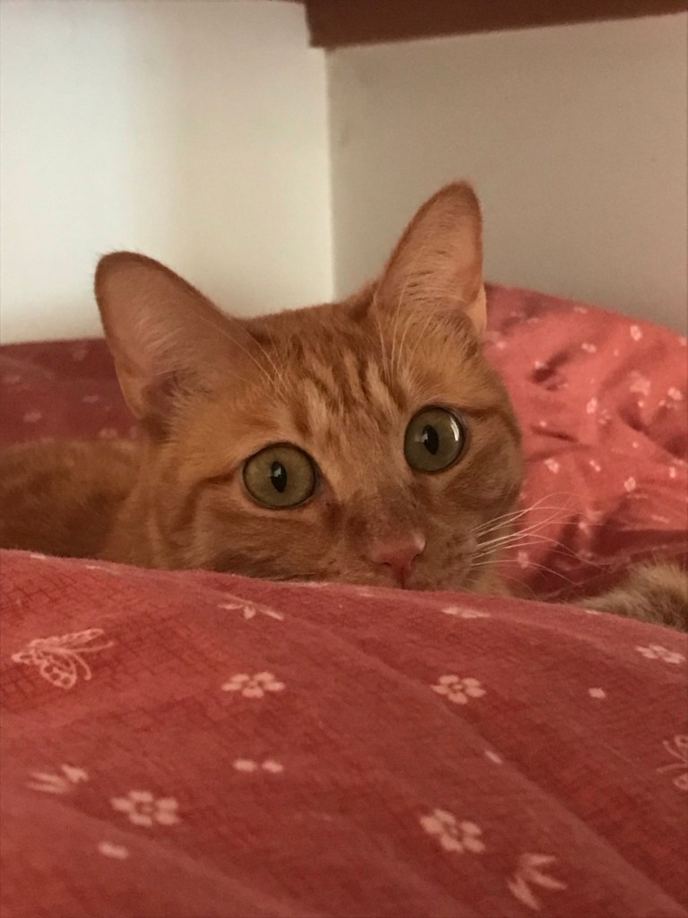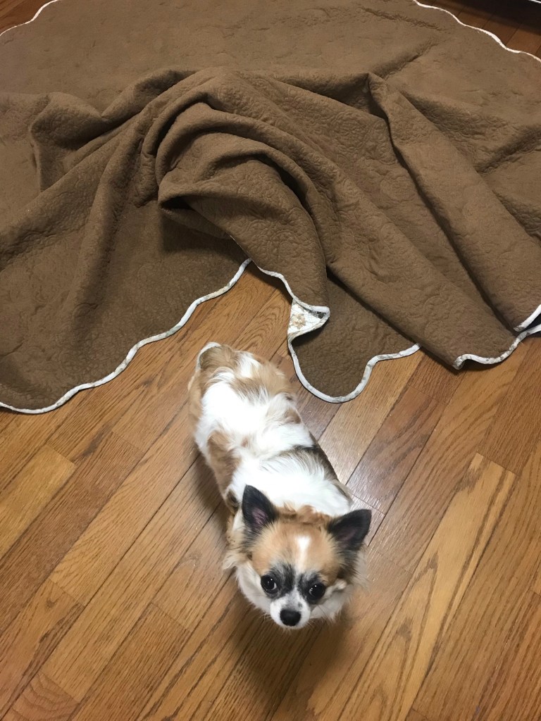 本日のおまけ『あれ?ポンちゃんだけ?はい。チコは(ホットカーペット)カバーのシワシワの中にいるよ』