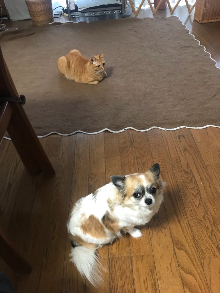 本日のおまけ『チコは暖かいホットカーペットがいいけど、ポンちゃんは『おいしい物ください』アピールのために、寒くてもフローリングに座ってるの』