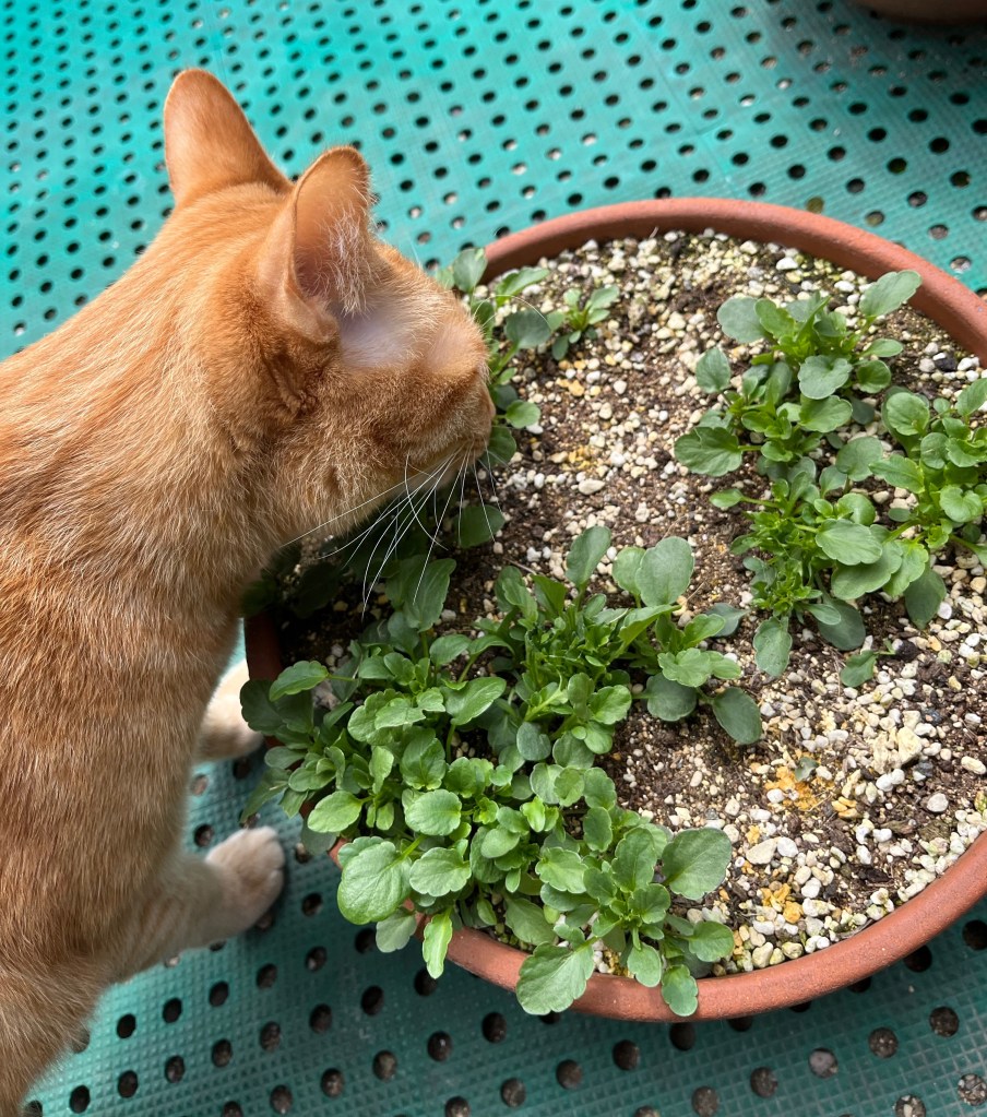 パンジーの葉っぱたべるの、見てくれたんだねー。なんかね、パンジーは根っことか花とか食べちゃいけないらしいの、、、🙀だから葉っぱだけなので、ちょうど良かった、、、😽