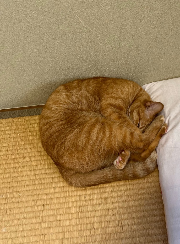 それからこんな風に畳で寝てると、ほんとは畳の匂いがチコにつくよ (これは新しい畳じゃないからダメだけど)。