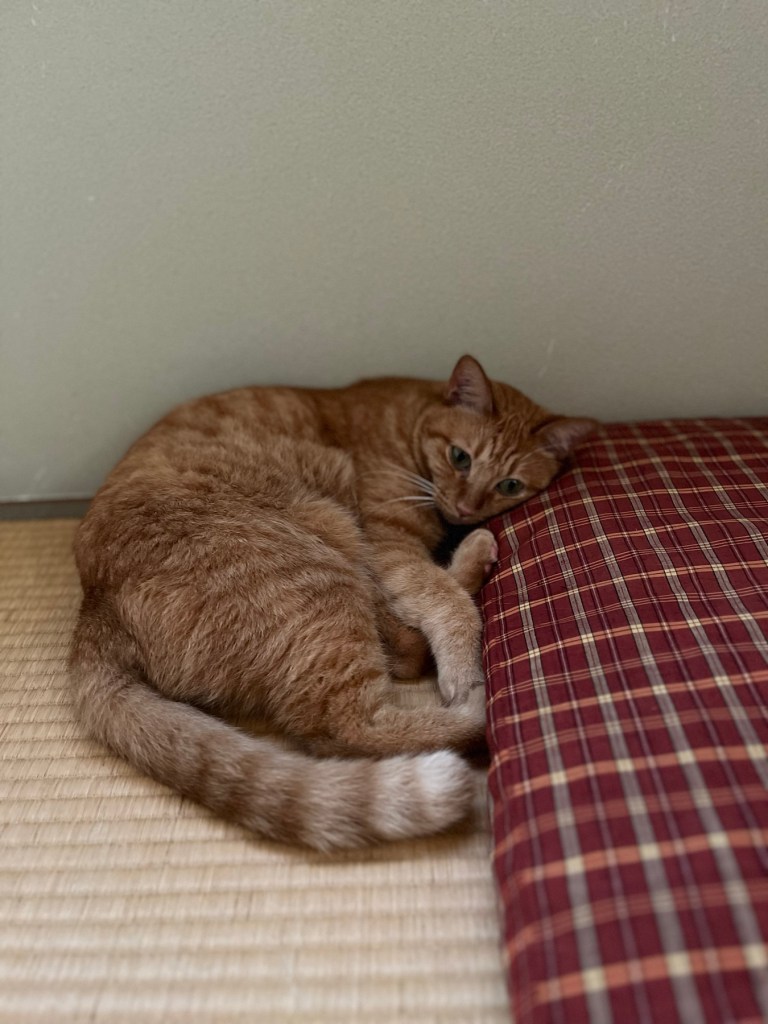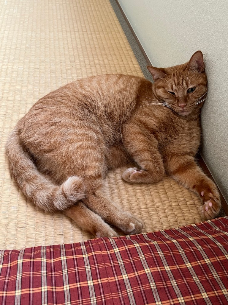だけど、お昼になると、やっぱり暑いからお昼ねしてるよ。夏の疲れが出てるのかな、、どこかに、もたれて寝ているよ、、