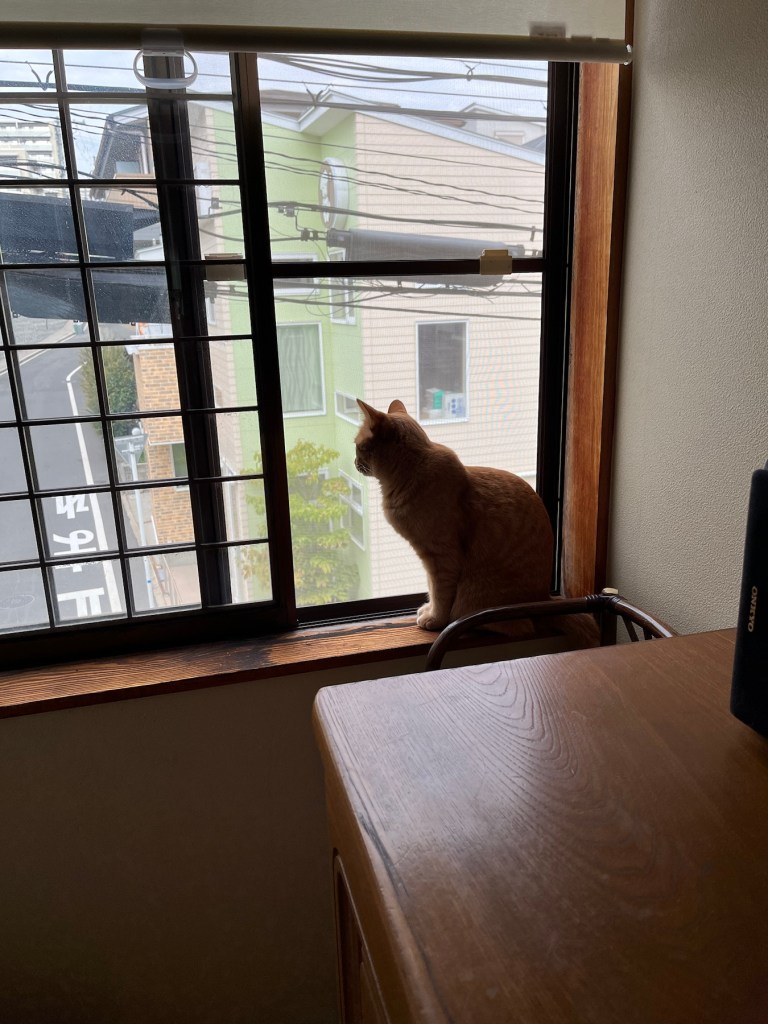 朝の涼しい時、チコはお外を眺めているよ、、小学生がぞろぞろ、登校している様子が見えるよ。