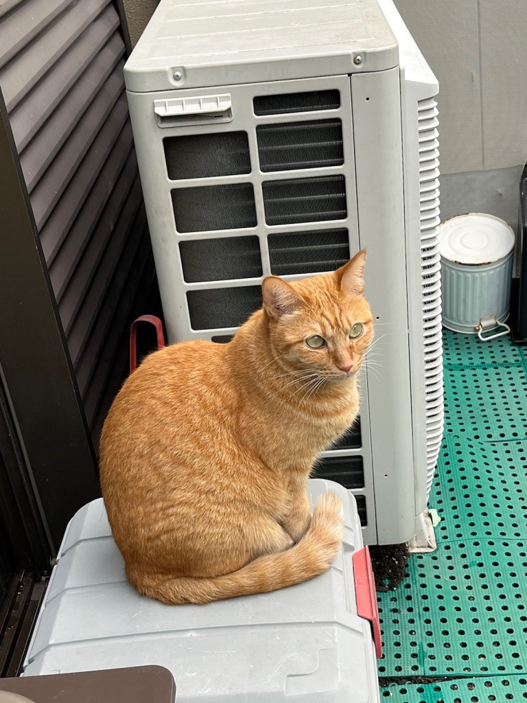 この頃、朝はとっても寒いよね、、それでもベランダには、出るよ。だけどまるく小さくなって座ってるでしょ?ほらエアコンの室外機って冷たいからね、、。