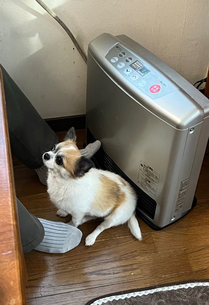 本日のおまけ『パパの前で、オヤツをもらうためにスタンバイしてるぽんりん。お尻熱くないの?焦げますよ。カチカチ山になりますよ』