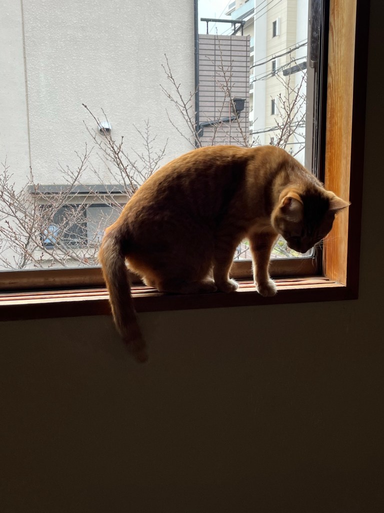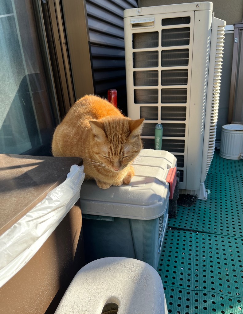 今朝も寒かったよね?けれどチコはベランダにいます。でも、いつもの室外機じゃなくて、ボックスの上にいるよ。