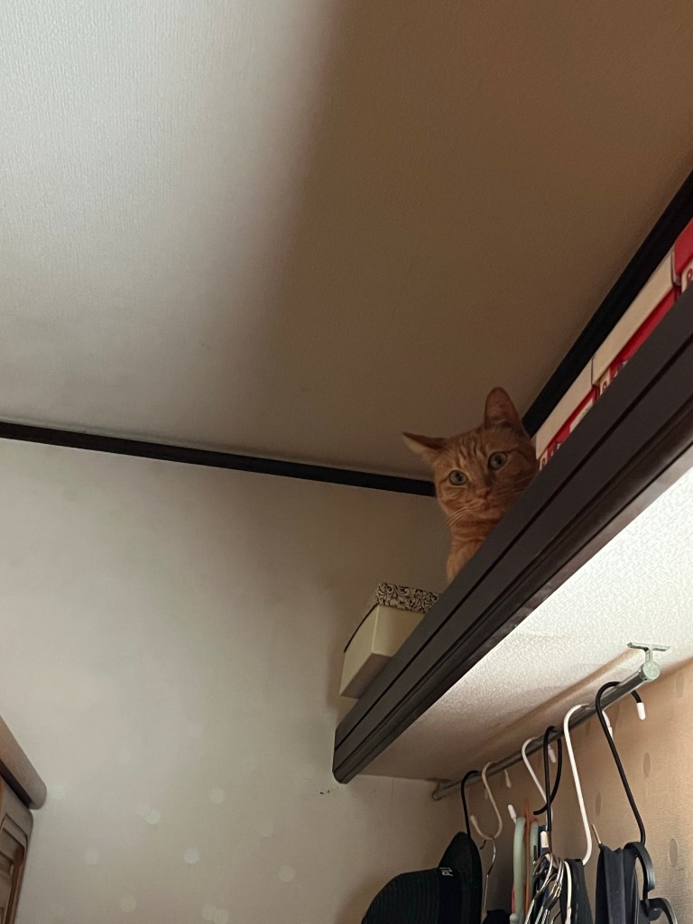 この二箇所-棚の上とタンスの上-は、向かい合っていて、チコはピョンて飛び移ることが出来るよ。楽しいです。