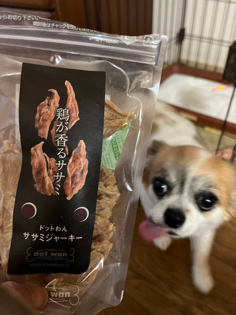 それでママが、いつもより(パパがくれはるやつより)上等のササミジャーキーを食べさせてくれはった。