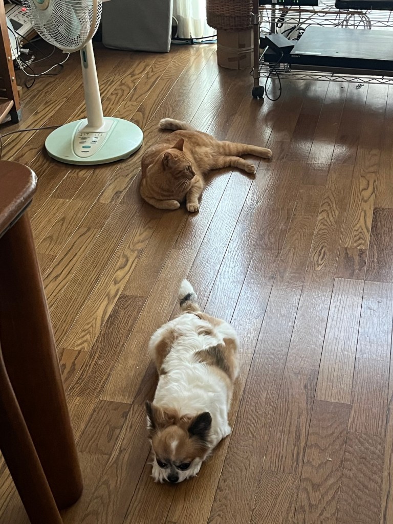 本日のおまけ『暑いし、なにもする気がないふたりです。でもママさんは、お団子やら小さなお膳を作るのに、忙しそう。(チコやぽんりんは会った事ない)おじいちゃんやおばあちゃんが帰って来てるから、食べてもらうんだってさ』