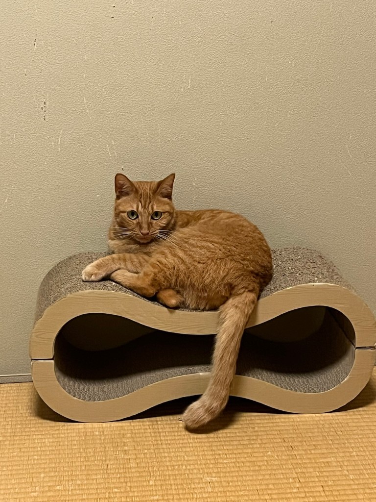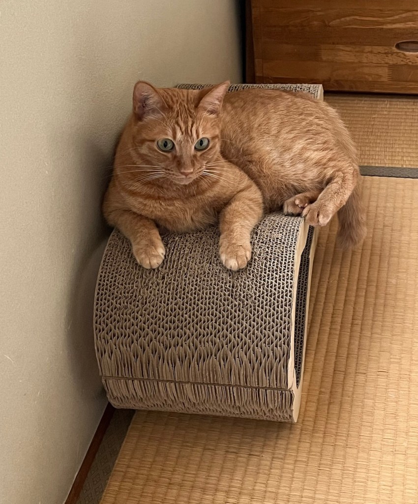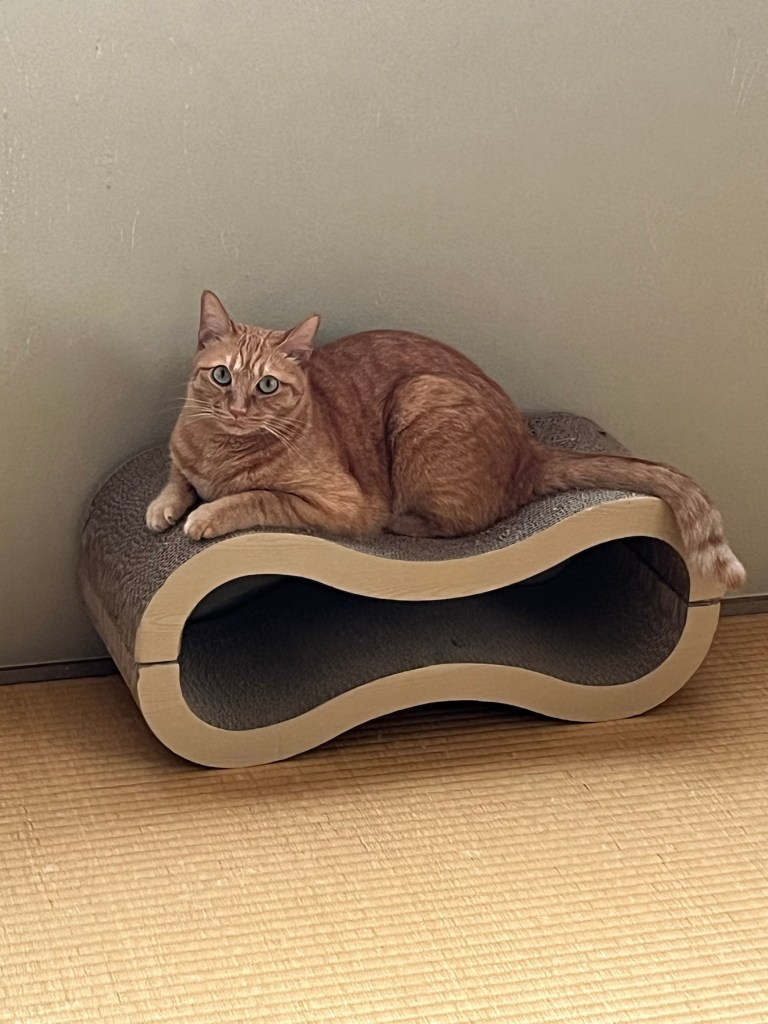 実はちょっと前に、新しい爪研ぎを買ってもらったよ。そこがとってもお気に入りで、しょっちゅう座っています。