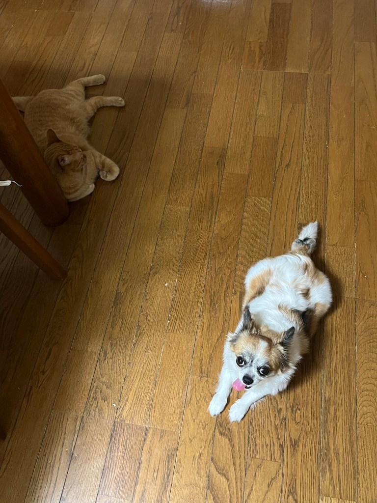 本日のおまけ『チコはこうやって、ぽんりんのそばに座っていることがあるんだけど、、ぽんりんはたいていママさんを見てるんだよね、、せっかくチコがいるんだから、チコのことを見てよ、、』