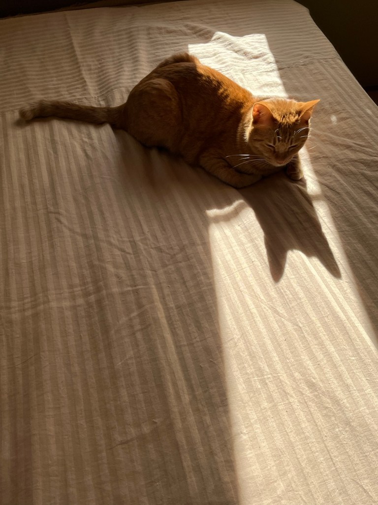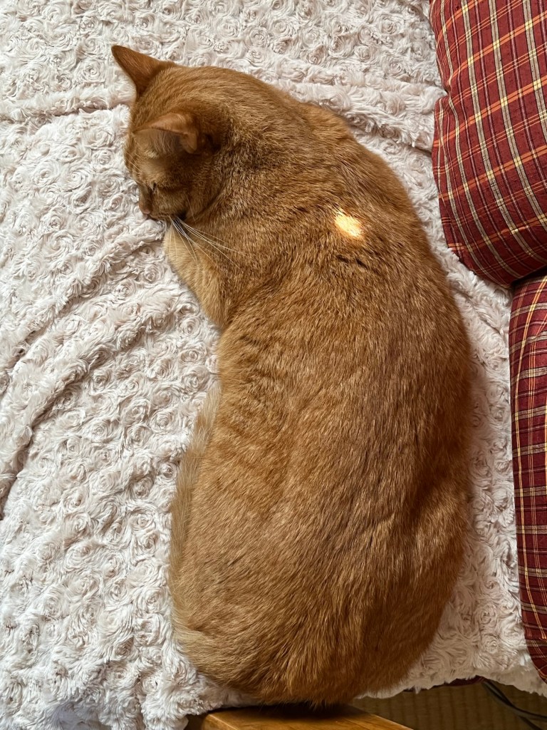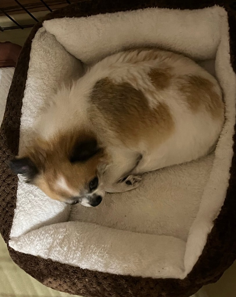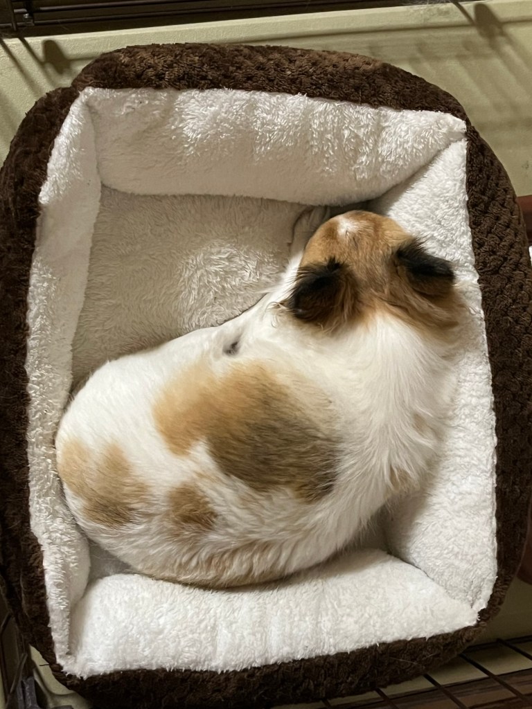 たしかに、こんなかたちで寝てるチコの格好は『のし餅』みたいね。でも、暖かくなると、ベッドの上でビョーンて伸びちゃうよ。