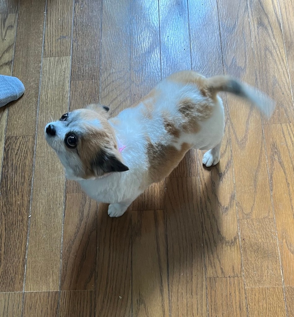 本日のおまけ『ちょっと前に、ぽんりんはカットに行って来たよ。いつもの『子犬カット』。だけど、しっぽも細くしてもらって子豚みたいでしょ?あら、『子豚カット』だった?!』