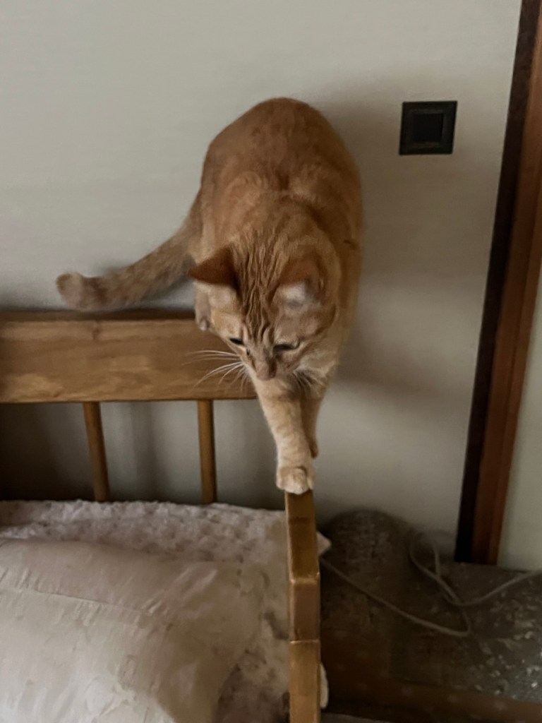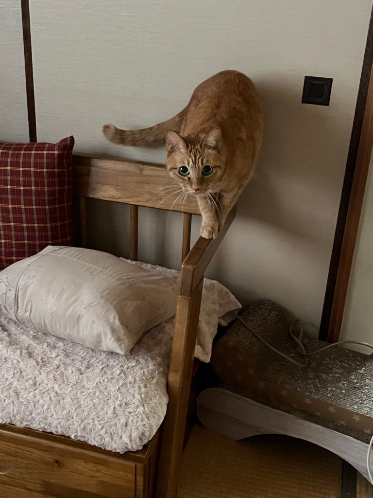そして雨の日は、くにゃいちの修行はおうちの中で、やってます。こういう細いところ見つけると、つい歩いちゃうよ。チコはバランス取るのも得意なの。