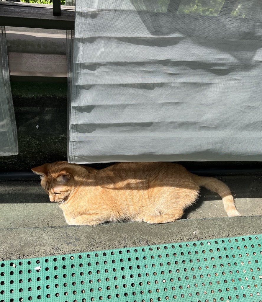 そして、お昼。お昼はこうやって、ベランダのミゾにすっぽり入るのがお気に入りなの。ずーっとここで暮らしたい位なんだけど、ママさんが『ぼちぼち帰ろうか』って迎えに来るんだよね、、