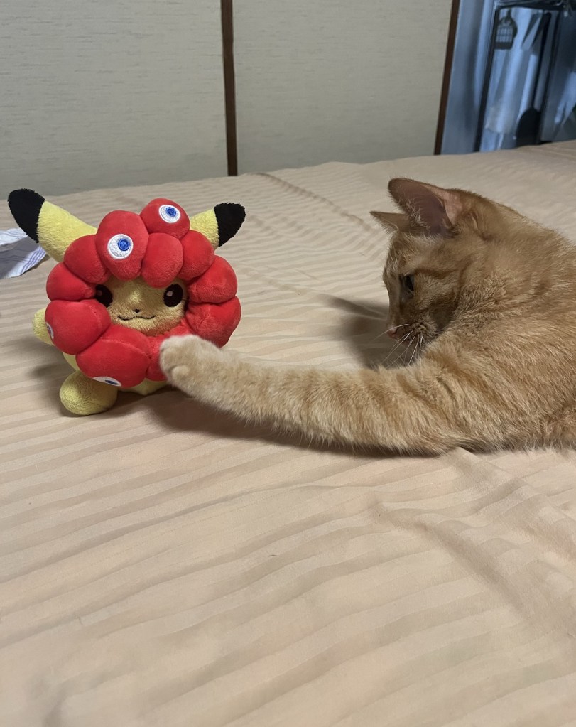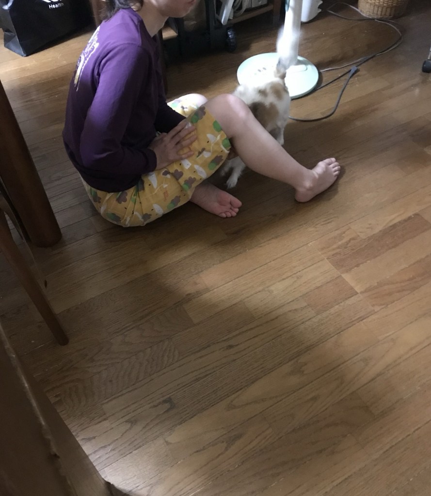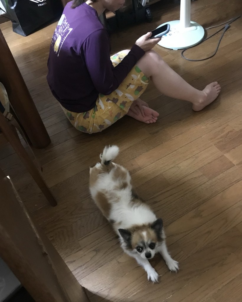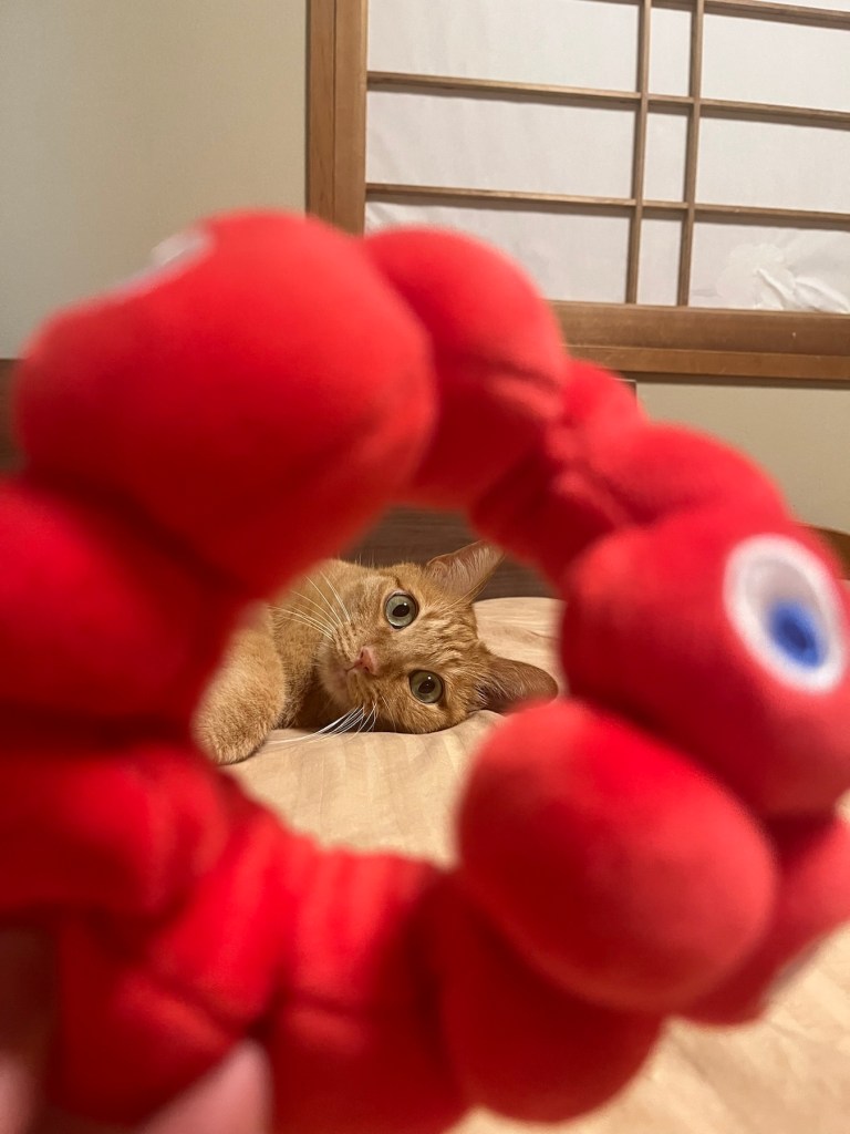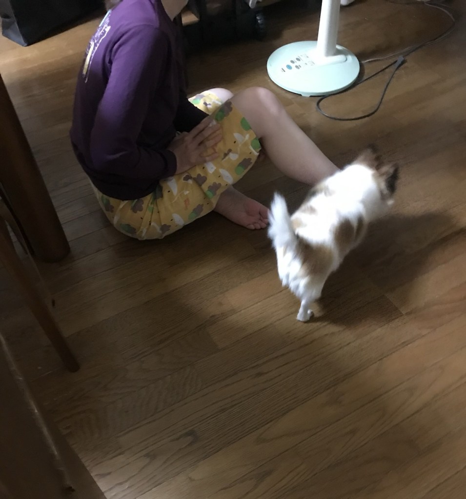 ママは、ミャクミャクをチコの頭に載せたいって頑張ってたんだけど、そんなのムリだから、、、だってチコは病み上がりですよ