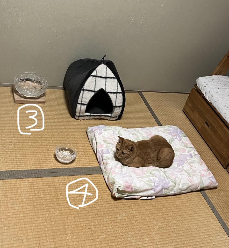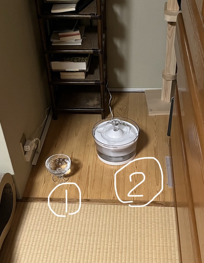 ね?すごい事になってるでしょ?猫はあまり、お水を飲まない動物なので、こうやってあちこちに置いた方が良いらしいってことで、ママさんが置いてます(チコの事なんだけど、まるでひとごとやね)。