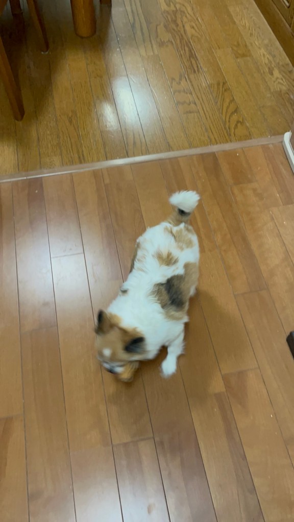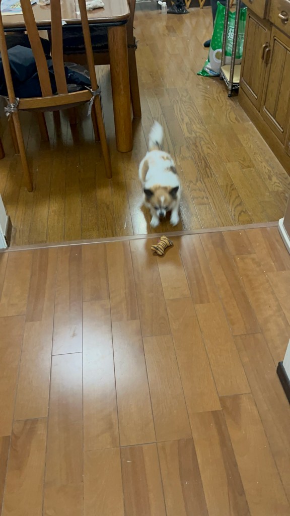 普通は、取りに行ったおもちゃをパパに返して、『もう一回投げてちょうだい』ってなるんやろな、、。けど、ぽんりんは『わたしの大事なおもちゃ、勝手に触らんといてーや』って思てるねん、