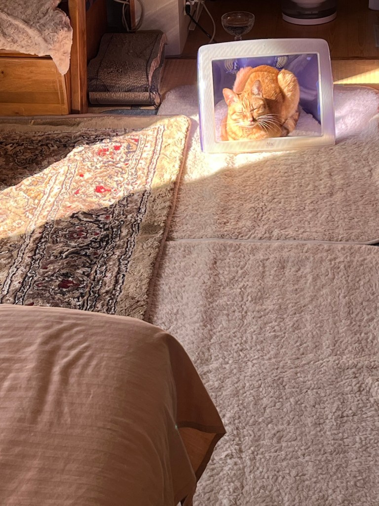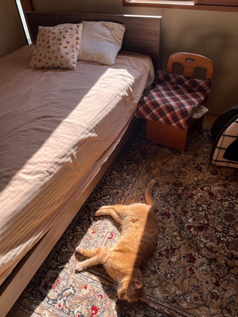 こんな風に日差しの範囲が狭い時は、ぴったりサイズにねころんで、お腹と手脚を温めたりね、、
